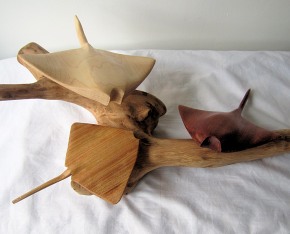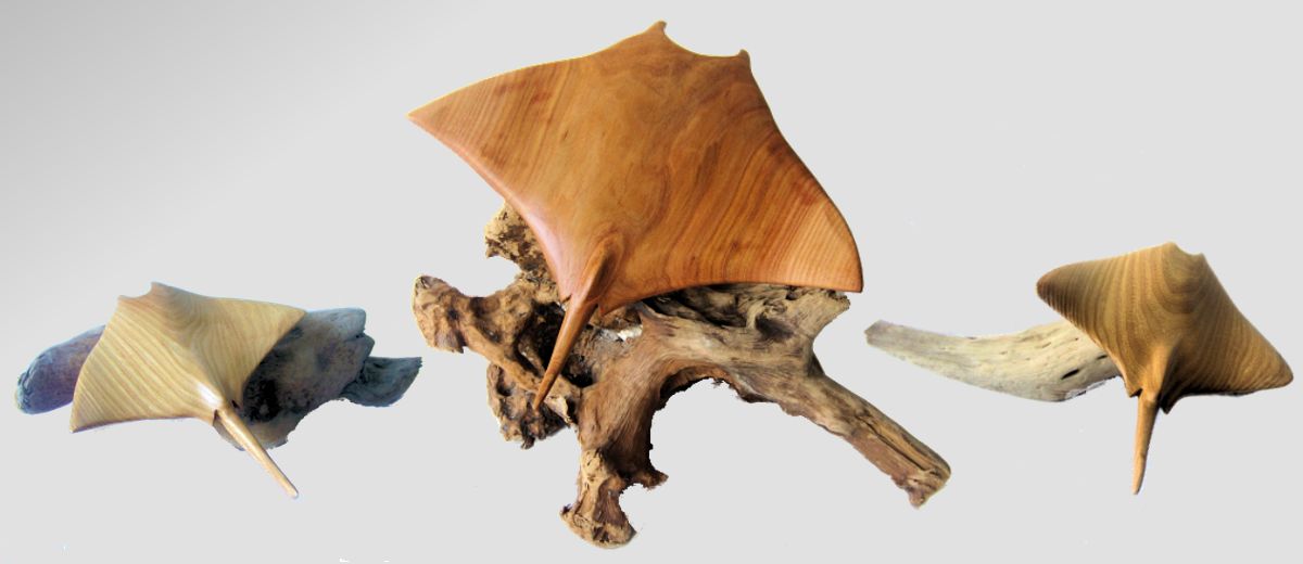 Three Manta Ray wood carvings on driftwood base (Ray07)