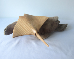 Hand carved wooden sculpture of a Manta Ray mounted on driftwood (Ray05)