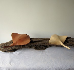 Two hand carved manta ray mounted on remains of a deck beam (Ray06)