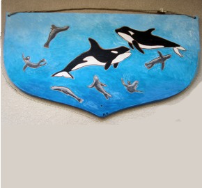 Killer whales (Orcas) and sea lions carved artwork painted on transom (art01)